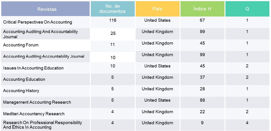 Siguiendo con los resultados de la muestra A, se elaboró la Tabla 3 que relaciona las revistas que contienen el mayor número de documentos en contabilidad crítica, adicionalmente se indica el índice H (métrica que mide tanto la productividad como el impacto de las citas de las publicaciones) y el Cuartil de las revistas (indicador que sirve para evaluar la importancia relativa de una revista). En primer lugar, se destaca que la revista con mayor volumen en publicaciones es Critical Perspectives On Accounting quizás se deba a que el foco principal de la revista es publicar artículos desde la perspectiva crítica en contabilidad. Por otro lado, la mayoría de las revistas halladas están afiliadas a Reunido Unido y Estados Unidos, indicando que en Europa y Norteamérica se encuentran los líderes de la contabilidad crítica (Beltrán & Feliciano, 2017). Finalmente es importante mencionar que 160 revistas han publicado estudio con este enfoque.