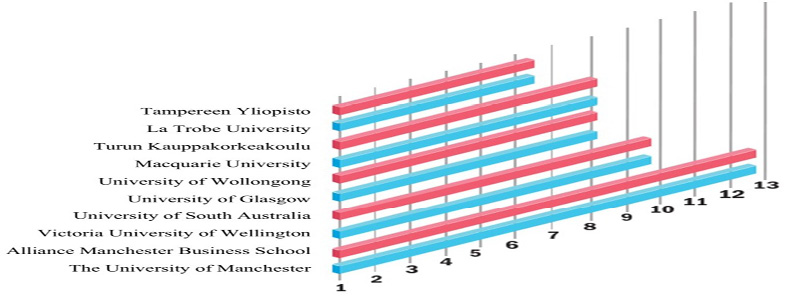 Posteriormente, la figura 5 se observan las 10 universidades con mayor participación literaria de un total de 160 instituciones educativas que han finando proyectos de investigación de contabilidad crítica, donde The University of Manchester y Alliance Manchester Business School lideran la lista, reconociendo de está manera que los investigadoras afiliados a estas instituciones están motivados e interesados en abordar las temáticas contables desde la perspectiva crítica para responder acertadamente a las necesidades y los problemas actuales que afronta la contabilidad (Haines-Doran 2019; Richardson, 2015; Laughlin, 1999; Lehman, 2013). Así mismo también existen estudios que presenta colaboración y cooperación entre instituciones para estas investigaciones (Gómez-Villegas, Ocampo-Gómez & Neu, 2021; Glendening, Mauldin & Shaw, 2019).
