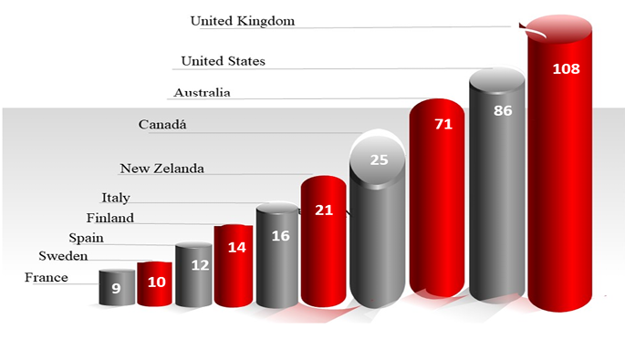 Basado en la revisión bibliométrica se identificó que se han realizado importantes investigaciones sobre contabilidad crítica en todo el mundo, específicamente 47 países. La Figura 6 ilustra los 10 países que más han publicado artículos sobre investigación crítica en contabilidad publicados en cuarenta y seis años de producción académica (1974-2020). En correspondencia, la región más productiva ha sido Europa en representación de Reino Unido, Australia, Italia, España y Francia; sin embargo, Norteamérica sigue teniendo una gran hegemonía en las investigaciones con 86 documentos.