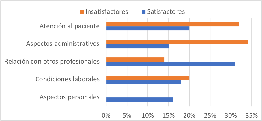En los resultados se identificaron 5 categorías que son la “atención al paciente”, los “aspectos administrativos”, la “relación con otros profesionales”, las “condiciones laborales” y los “aspectos personales”.