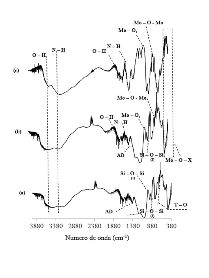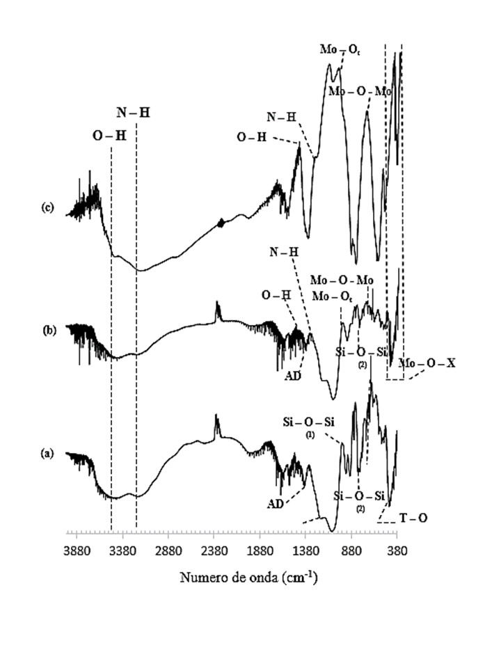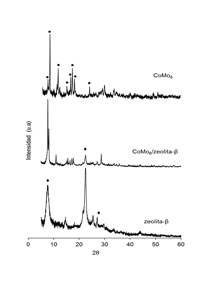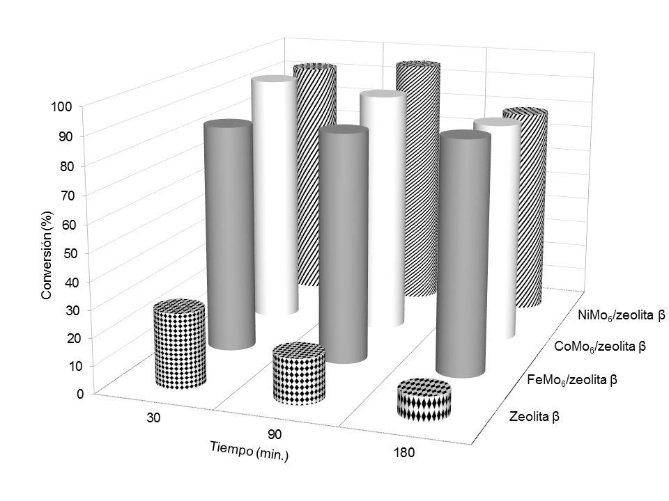 Precursores catalíticos de polioxometalatos de FeMo, CoMo y NiMo tipo Anderson-Evans soportados sobre zeolita β en la hidrodesulfuración de tiofeno fue investigada. Los sólidos fueron caracterizados por análisis elemental (ICP plasma), área específica (SBET), difracción de rayos X (DRX) y espectroscopía infrarroja (FTIR). El soporte se impregnó con una solución acuosa del heteropolioxomolibdatos tipo Anderson-Evans de FeMo, CoMo y NiMo. El análisis elemental de Fe, Co, Ni y Mo dio resultados de acuerdo con la exactitud experimental de las relaciones atómicas nominales para cada precursor. La presencia de zeolita β, (NH4)3[FeMo6O24H6]•7H2O, (NH4)3[CoMo6O24H6]•7H2O y (NH4)4[NiMo6O24H6]•5H2O se verificó por DRX, mientras que el FTIR permitió asignar los estiramientos y flexiones de los grupos funcionales presentes en la estructura del heteropolioxomolibdato Anderson-Evans y la zeolita β. Los precursores catalíticos FeMo6/zeolita β, CoMo6/zeolita β y NiMo6/zeolita β mostraron mayor área específica (204-268 m2/g) que los heteropolioxomolibdatos tipo Anderson-Evans (1-3 m2/g). Los catalizadores provenientes de heteropolioxometalatos tipo Anderson-Evans de FeMo, CoMo y NiMo soportados en zeolita β presentaron mayor actividad HDS que los precursores no soportados (FeMo6/zeolita β y CoMo6/zeolita β), lo cual está asociado a la formación de mayor número de sitios activos.