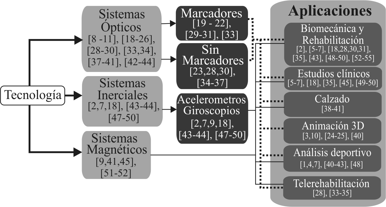 El movimiento humano ha sido sujeto de numerosas investigaciones, principalmente en las ciencias biomédicas, ciencias del deporte y animación 3D. Dada la gran cantidad de tecnologías disponibles en el mercado, surge la necesidad de realizar una vigilancia tecnológica que determine sus principales ventajas y limitaciones, aplicaciones y situación actual de Colombia en cuanto a estudios que involucren este tipo de tecnologías. Para lograrlo, se realizó una revisión sistemática de literatura científica a nivel global, siguiendo los parámetros de las metodologías PRISMA y PRISMA P-2015. Se encontró que las tecnologías cinemáticas de análisis de movimiento se dividen en ópticos, inerciales y magnéticos, dónde los sistemas ópticos reportan el mayor número de publicaciones, siendo la tecnología Vicon la más utilizada, debido al gran abanico de aplicaciones que presenta. En cuanto a Colombia, se evidencia poca participación en estos estudios, por lo que se debe fortalecer esta competencia tanto a nivel académico como empresarial.