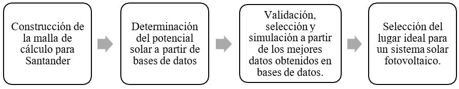 El crecimiento acelerado de la demanda energética es un fenómeno mundial. Para suplir esta necesidad, una de las mejores opciones es la diversificación de la matriz energética de los países. La energía solar surge como una alternativa importante debido a su carácter inagotable y el reciente incremento en su uso. En esta investigación, se evalúa el potencial solar de Santander por medio de una distribución nodal a través de la construcción de una malla. Se utilizaron versiones gratuitas académicas de Meteonorm y PVsyst; así como la base de datos libre Nasa Retscreen, y el Mapa Interactivo del IDEAM. A partir de esto se establecieron los municipios con mayor potencial y se calcularon los factores que determinan el rendimiento de un sistema solar fotovoltaico.