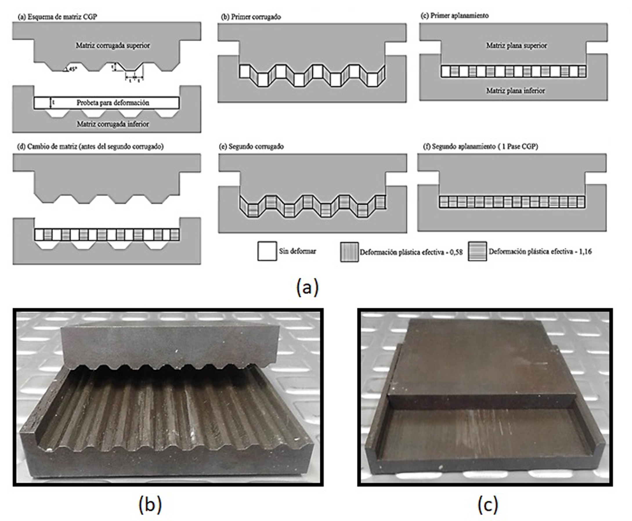 En este trabajo se evaluó la viabilidad de implementar la técnica presión calibrada restringida (CGP) en el procesamiento de la aleación de aluminio PRODAX. Para esto, se realizaron pruebas de caracterización química mediante Fluorescencia de Rayos X (XRF), caracterización microestructural mediante microscopía electrónica de barrido y caracterización mecánica mediante ensayos de tracción y microdureza. El material fue sometido a un tratamiento térmico de solubilizado a 525 °C durante 60 minutos para eliminar el efecto endurecedor de los compuestos de segunda fase; sin embargo, se evidenció agrietamiento al aplicar el primer pase de CGP a una velocidad de deformación de 5 mm/min. Por tanto, se realizó un tratamiento térmico de solubilizado a 540 °C durante 480 minutos con el fin de recristalizar la fase alfa de aluminio y mejorar significativamente la respuesta del material ante un CGP con una velocidad de deformación a 0.1 mm/min.