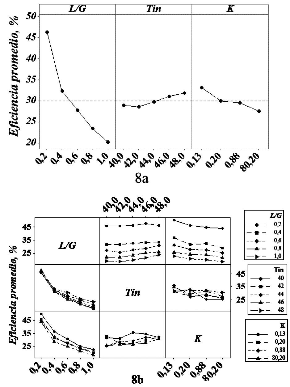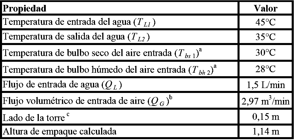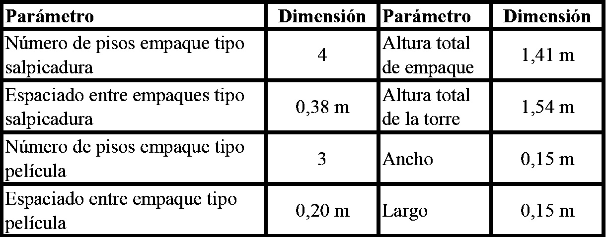 En el presente trabajo se realizó el diseño, montaje y puesta en marcha de una torre de enfriamiento a escala de laboratorio de 0.15 m de lado y 1.54 m de alto, adecuada con empaques tipo salpicadura hechos de madera, acrílico, hierro y aluminio, y de tipo película hecho de acrílico. Se evaluó el desempeño de la torre a diferentes relaciones de flujo másico L´/G´ en el rango de 0.2 a1.0, temperaturas de entrada de líquido en el rango 48-40°C y diferentes materiales y geometrías de empaque. Se desarrolló una correlación no lineal del coeficiente volumétrico global de transferencia de masa Kya como función de los diferentes factores estudiados mediante análisis estadístico. Se notó que el desempeño de la torre de enfriamiento mejora en altos valores de Kya y de eficiencia global cuando se realizaron incrementos de la relación L´/G´ operando con empaques que contienen valores bajos de conductividad térmica tal como la madera y el acrílico y usando altos valores de la temperatura del agua de entrada. Un aumento en el área superficial del empaque de un 350% resulta en un incremento en eficiencia hasta de un 30% mostrando la importancia de realizar un análisis de costos de ingeniería