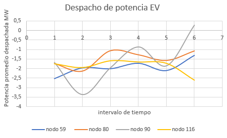 En este documento se especificarán los resultados obtenidos al desarrollar una función de optimización de costos para el despacho de energía en múltiples (6) periodos de tiempo considerando la variabilidad y la incertidumbre de diversas fuentes de generación de energías renovables como lo son el sol, el viento, además de los ciclos de carga de Vehículos Eléctricos (VE) en una red de generación distribuida. El algoritmo de optimización heurístico utilizado fue tipo DEEPSO (combinación de enjambre de partículas y evolución diferencial) en el cual se tuvo en cuenta costos de penalización por la sub o sobre estimación del potencial energético, penalizaciones por limitaciones físicas del sistema, además de la optimización del flujo de potencia mediante la inyección de reactivos con capacitores tipo shunt o mediante la utilización de taps de transformadores. El resultado final de la investigación fue el desarrollo de un algoritmo tipo DEEPSO para la optimización del despacho económico de energía en sistemas de potencia con alta penetración de fuentes renovables.